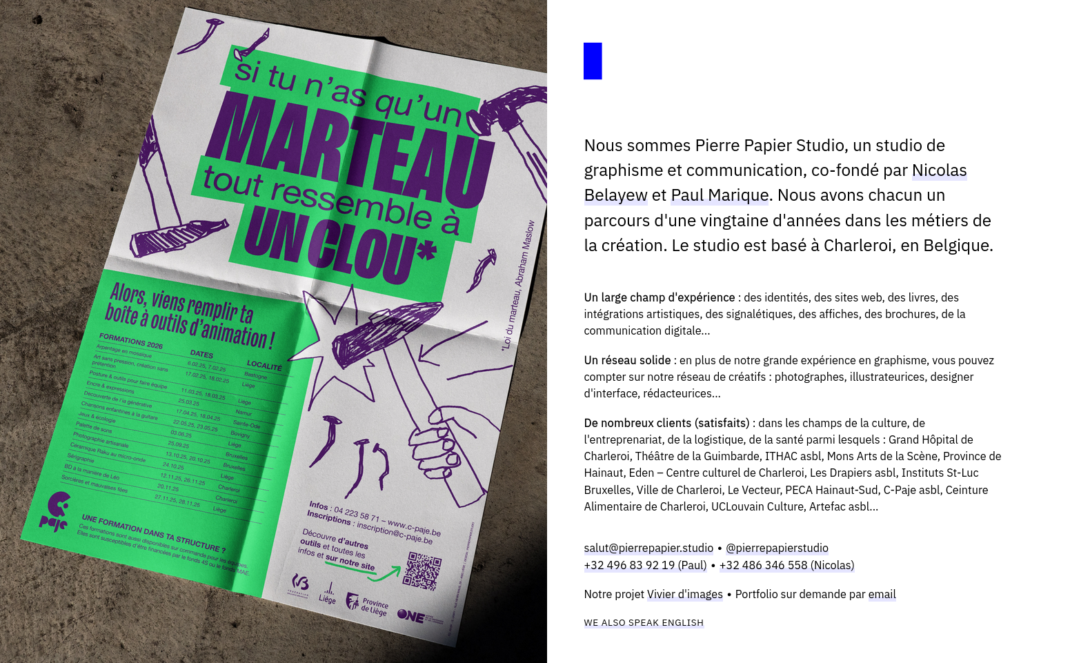 Après quelques recherches et rencontres, c'est au pays de Charleroi que nous avons trouvé chaussure à notre pied, auprès de "Pierre Papier Studio". D'abord séduits par leur chouette nom, ensuite par le type de collaborations qu'ils avaient déjà mené et la qualité de leurs réalisations. Nous avons donc rencontré Paul et Nicolas au C-paje et avons abdiqué : c'était bien eux qu'on cherchait. Leur analyse rapide et efficace, leur proposition en plein dans le mille, le côté un rien décalé et un tantinet subversif nous a fait leur dire "ON Y VA !" Et c'est de là que sont nées cette carte et cette affiche qui vous présentent nos formations FWB 2026.
