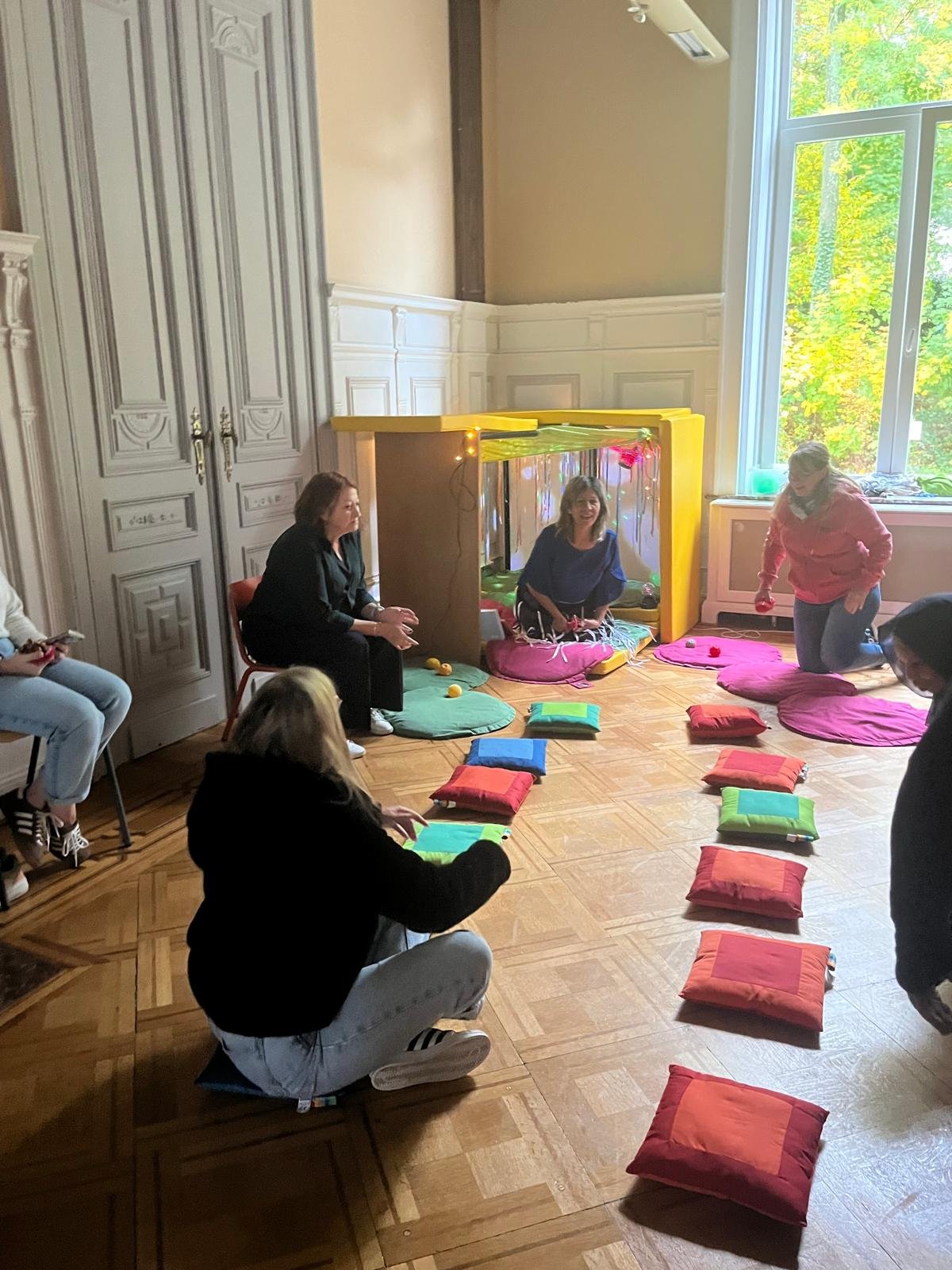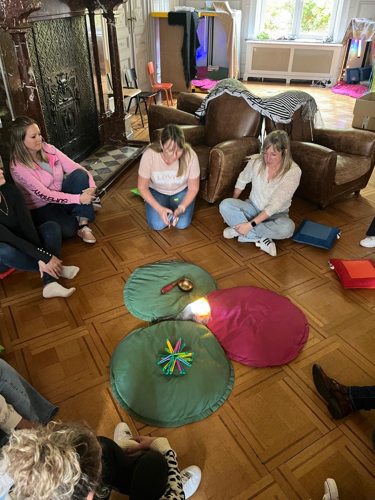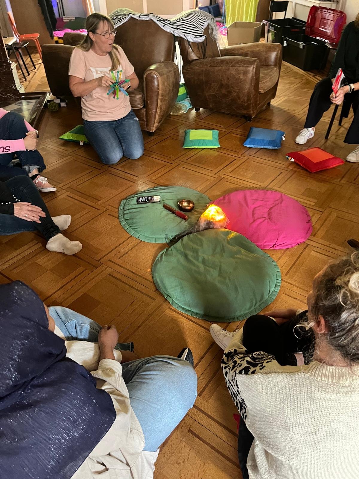 - Approche pratique: découverte et expérimentation de différents outils de relaxation (massage, respiration, yoga…) et d’aménagements de l’espace (lumière, rideaux…) qui favorisent la diminution de l’agitation autant des enfants que de leurs accueillant(e)s