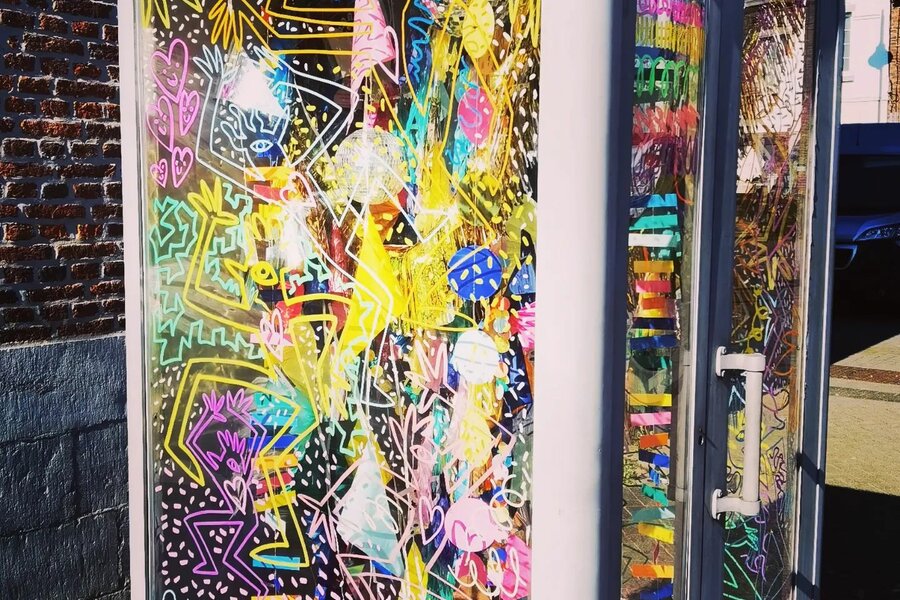 Parmi ces activités, l’exposition, au titre joliment paradoxal « Entrer dehors, sortir dedans », de Jo Dessine Un Peu (aka Jo Delannoy). Cet artiste sérigrapheur et illustrateur est aussi animateur artistique. Cette double casquette lui permet de proposer une exposition âme d’enfant – compatible. Ceux-ci sont invités à rejoindre un univers joyeux, coloré parfois même pailleté sur la thématique de la maison : celle dans laquelle on vit, celle à laquelle on rêve, celle qui s’adapte à ses habitants…