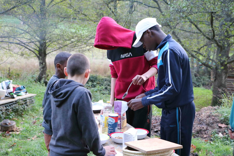 Les jeunes se répartissent alors en trois sous-groupes, pour réaliser trois recettes : une soupe au potimarron et aux orties, des petits pains aux herbes et un coulis de baies rouges. On échange, on rigole, on s’échange des trucs et astuces. « Tenir entre ses dents le bout de bois d’une allumette permet de ne pas pleurer quand on coupe les oignons ! », apprend-t-on. Et ça marche apparemment !